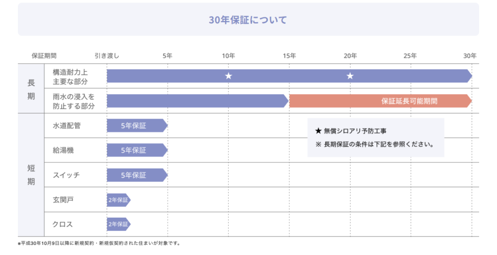 一条工務店の場合、新築時の性能をより長く持続させるために、安心30年長期保証と、必要な点検を無料で行ってくれます